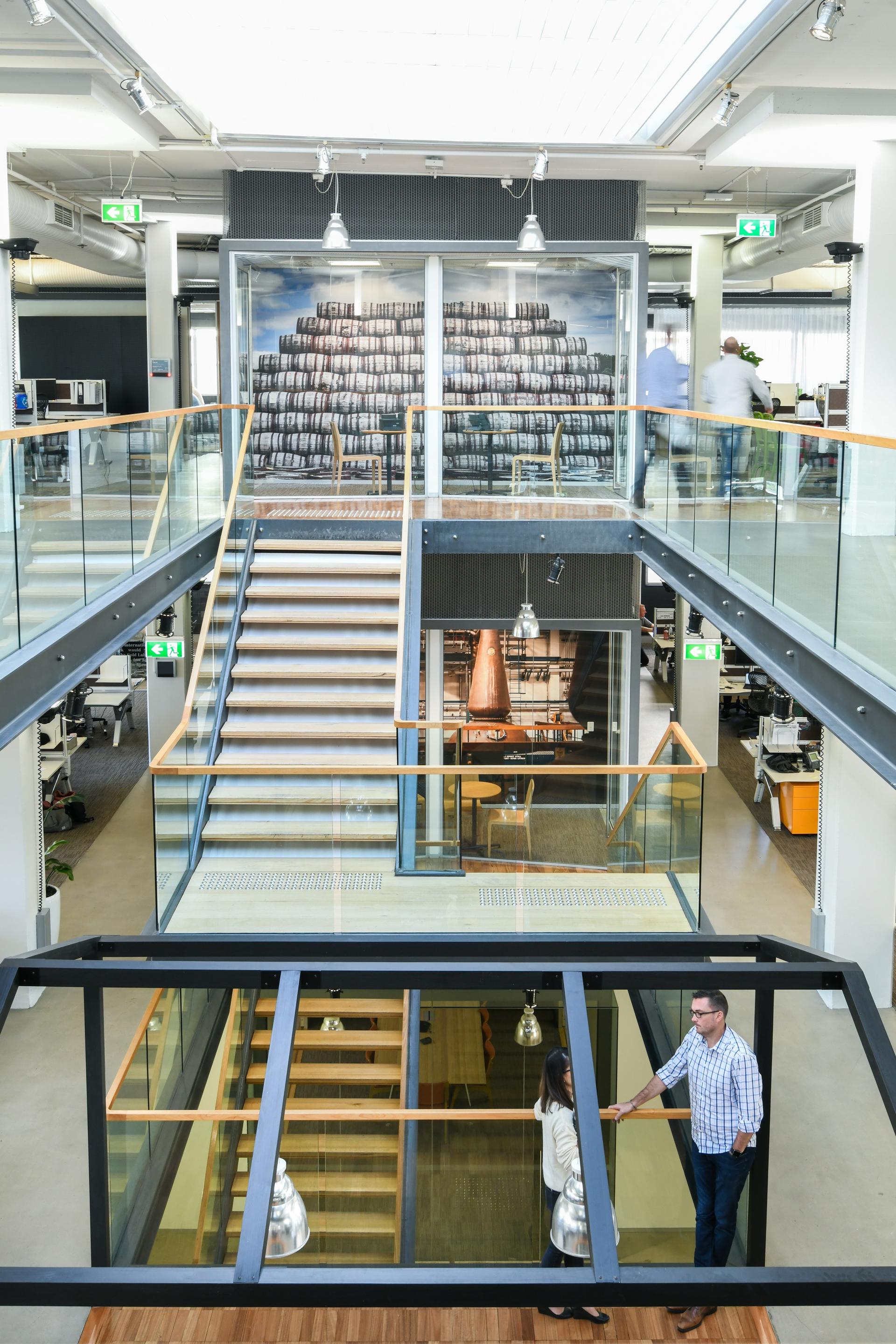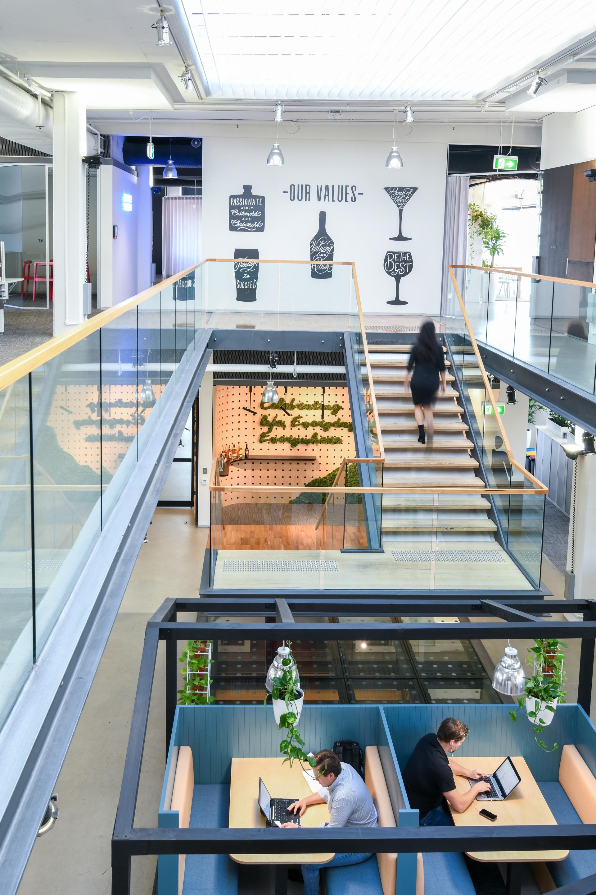 Global beverage leader Diageo engaged Interior2 to deliver a comprehensive transformation of their head office on Sydney’s Lower North Shore. The project focused on creating a dynamic, contemporary workplace that reflects the company’s premium brand portfolio while enhancing functionality and employee experience.