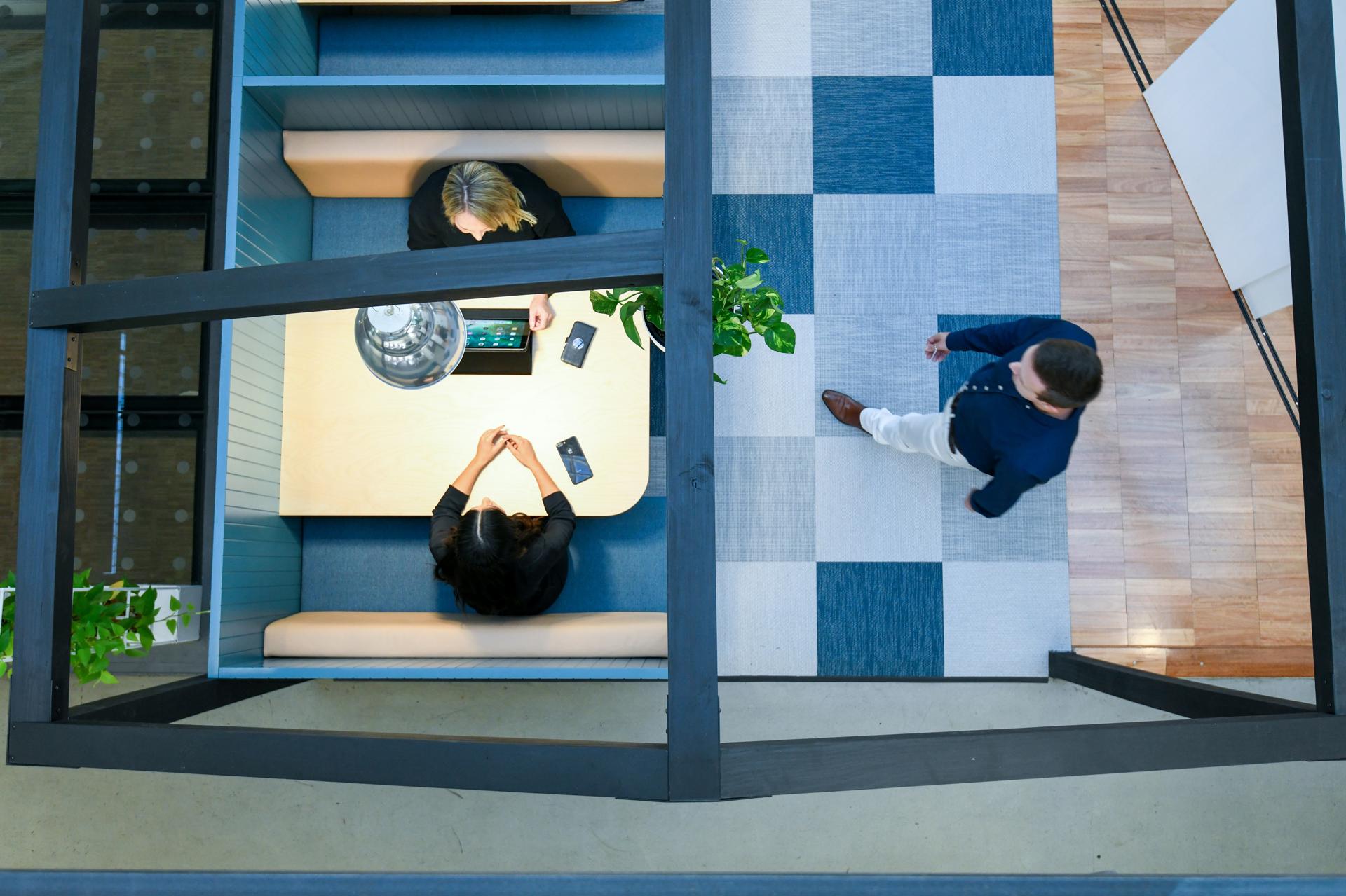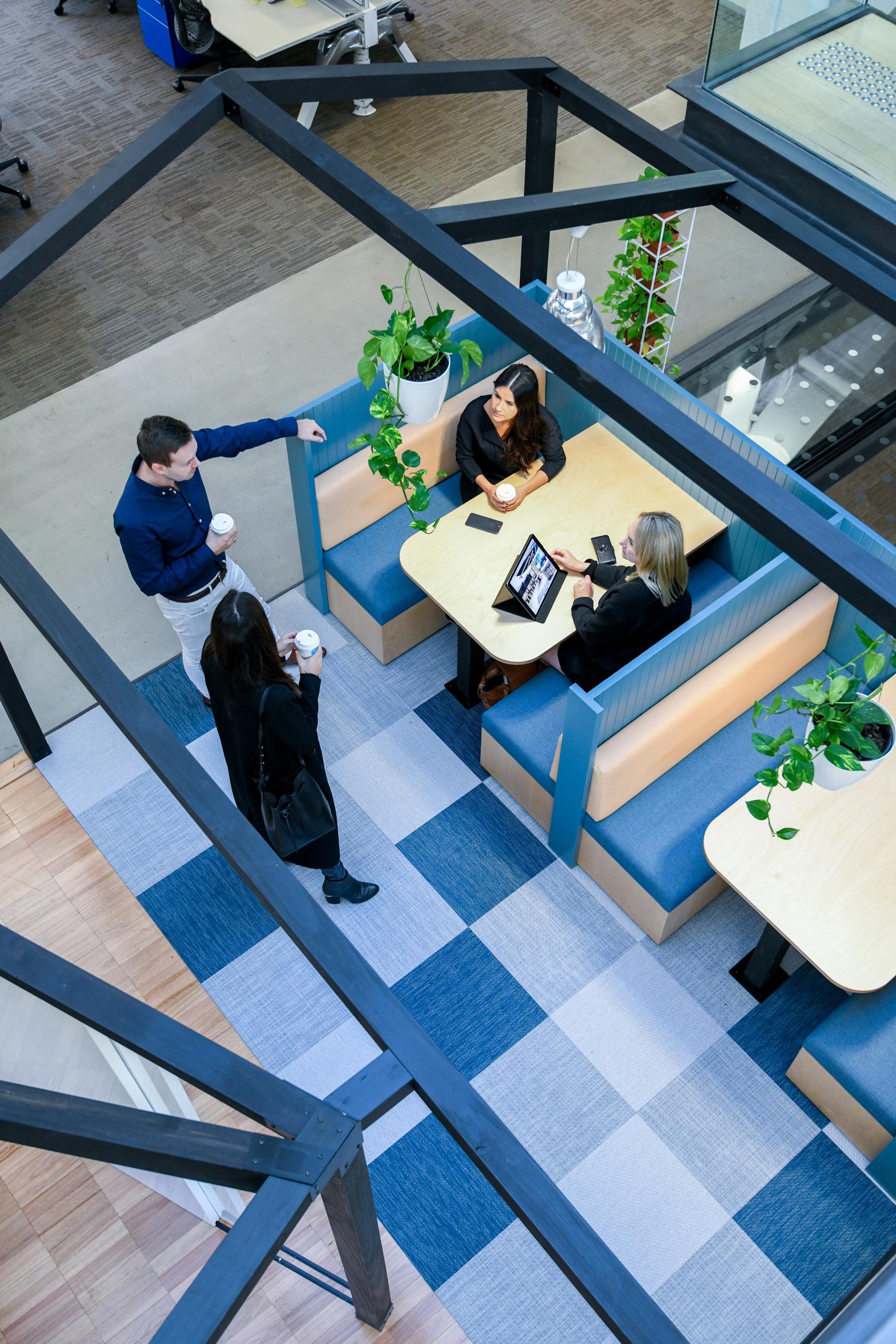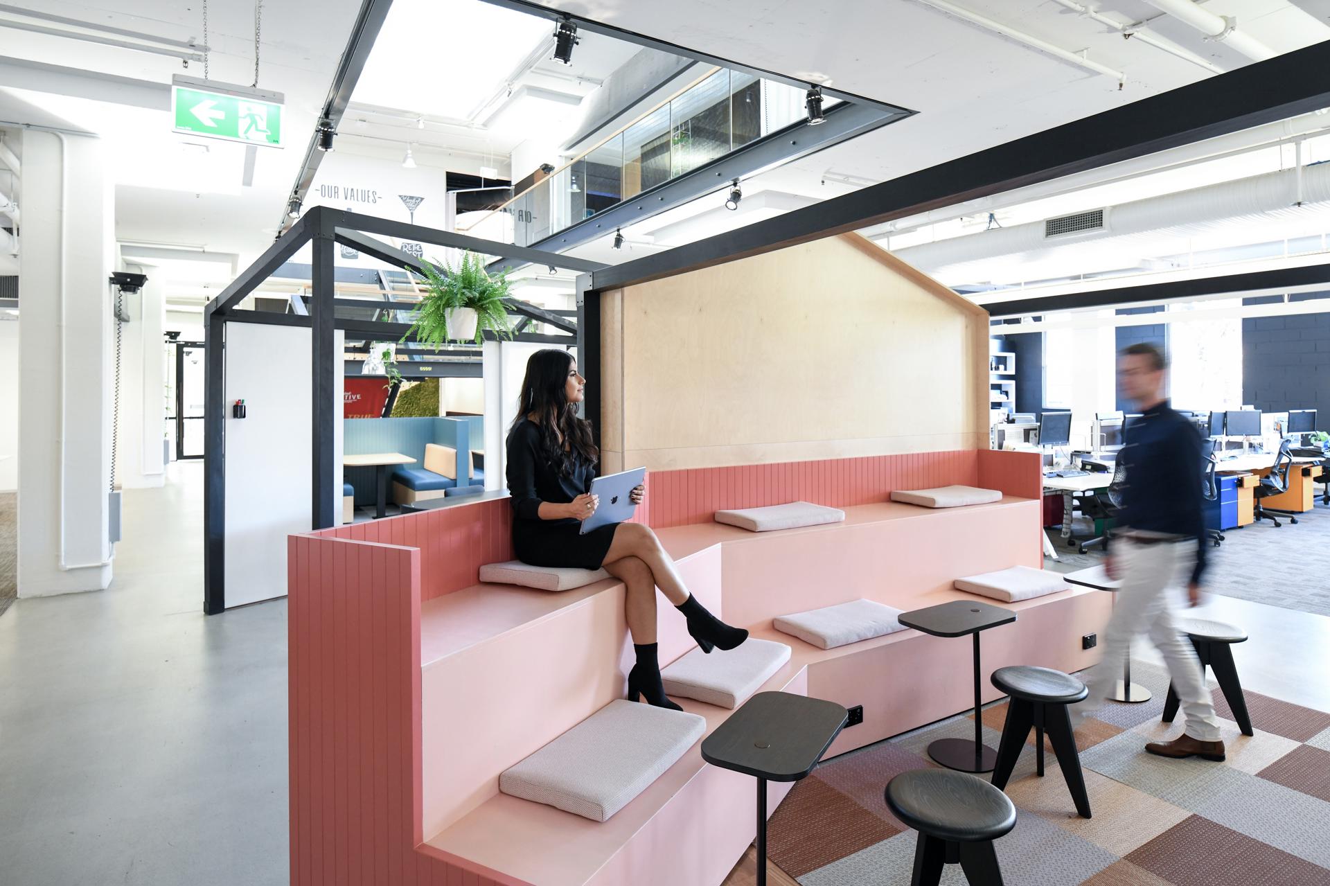 The central atrium was also significantly enhanced and now serves as a multifunctional hub within the office. It incorporates booth seating for informal collaboration, a purpose built auditorium for presentations and events, flexible meeting areas, and a dedicated conference call hub encouraging both connectivity and versatility in how the space is used.