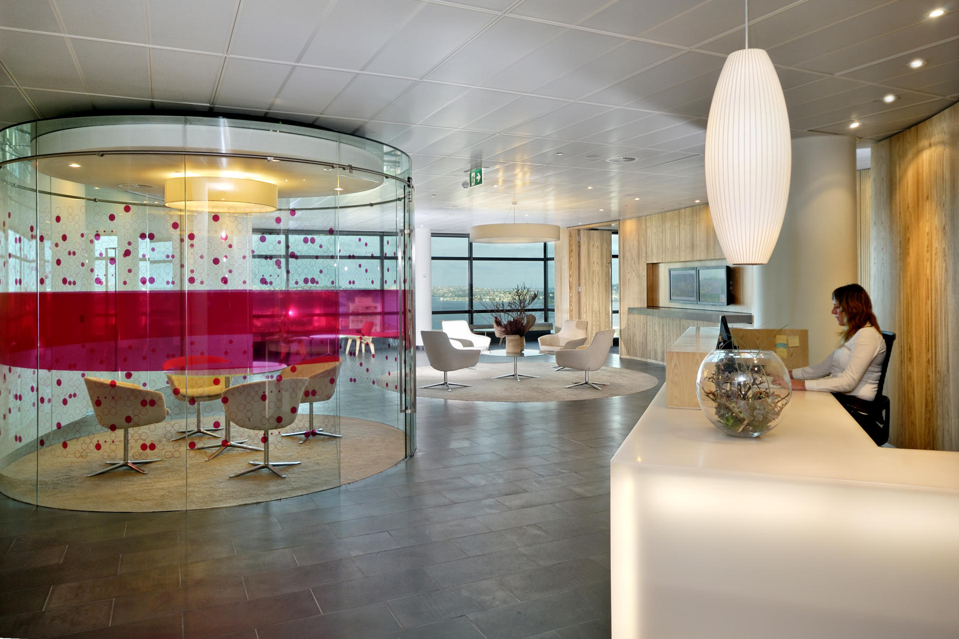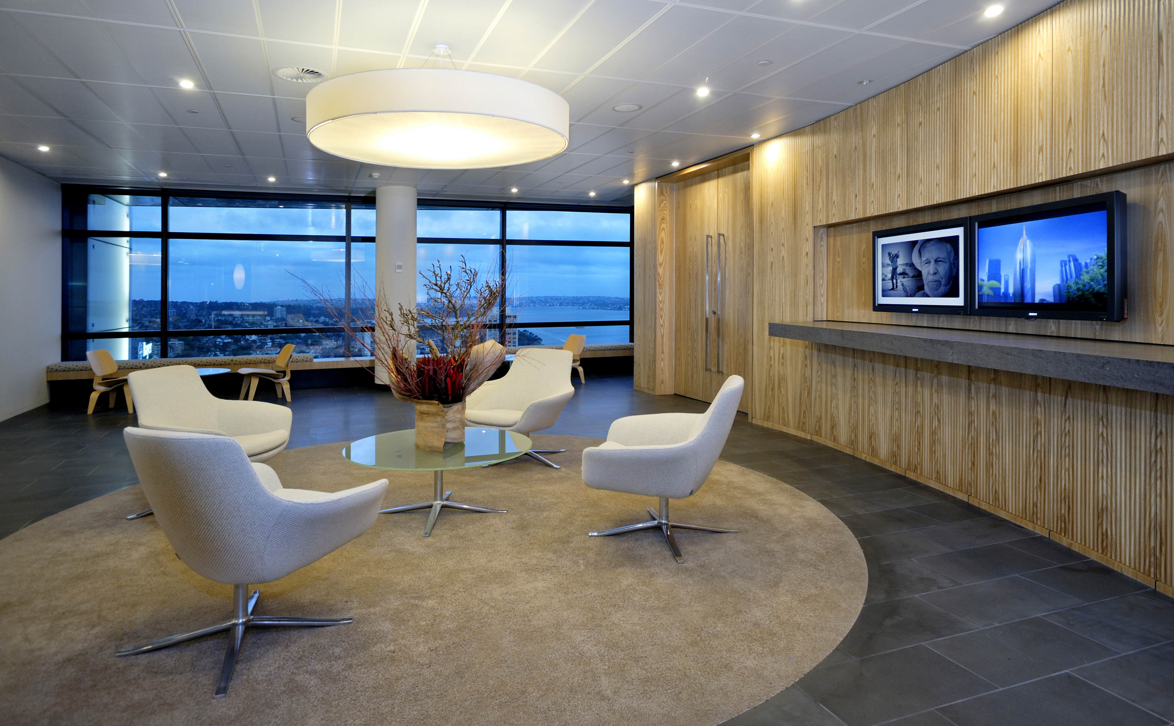 Curved glass, timber veneer linings, bespoke joinery and natural stone were employed extensively throughout the Salmat fitout, creating a warm, sophisticated, and cohesive interior environment. A standout feature is the reception area’s curved glass meeting room, which functions both as a striking architectural element and a practical collaborative space.